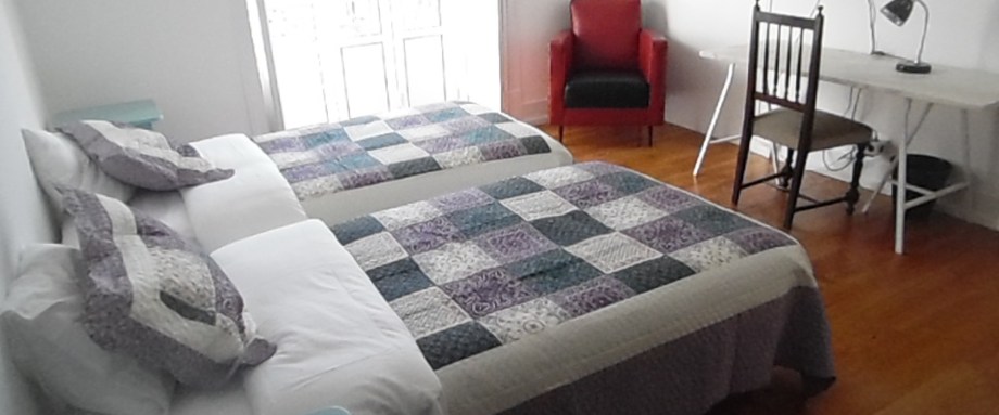 Our largest twin/double room has an own souther-faving balcony, just above the treetops of Avenida João Crisóstomo. Two other, rectangular rooms have windows that give on to a quiet inner courtyard. The fourth twin/double room with stuccoed ceiling has a French door and wooden shutters giving access to the large closed veranda on the back of the apartment.